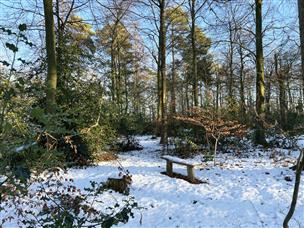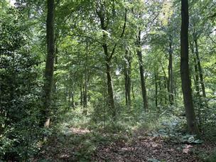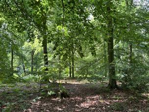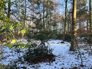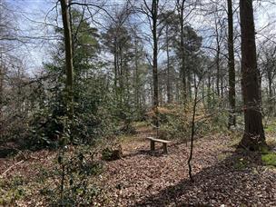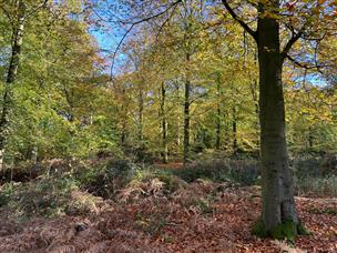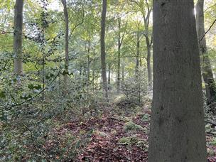 Lysander Copse is reached via a good stone track, to the ride-stop entrance where there is space to turn a vehicle. From this point, a path leads off amongst mature and beautiful beech and Scots pine trees, towards a rustic bench set in a small clearing. The wood also contains a few larch trees, the odd oak and sycamore as well as some rowan. Beneath the tall canopy, most of the shrub layer is comprised of holly bushes, which give the wood excellent privacy, along with a plethora of beech seedlings: the next generation. Across the floor are bracken ferns and blackberry, as well as mosses and woodland grasses.