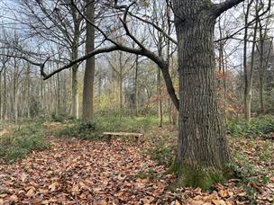 The path forks as there is a circular route within the wood. Taking the left fork and following it clockwise, after a short distance a larger oak and impressive sweet-chestnut tree is reached, and a rustic bench is located close by. Most of the larger trees within Sun Copse are sweet chestnut, beech, sycamore and oak.