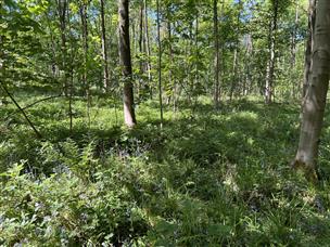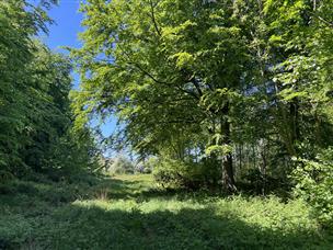 Continuing on to the western boundary, a wide grassy track runs the length of this edge of the wood, with an old hedgerow that borders the farmland beyond. A ditch (the centre of which is presumed to be the true boundary line) is flanked by characterful coppiced hedgerow trees such as hawthorn, hazel and ash. A larger oak tree can also be found along this edge. Around 50m down this track, the circular route returns into this beautiful and varied woodland through more sunny open areas and under the shade of the tree canopies. Lovely aspects of the wood are awaiting to be discovered at each turn.